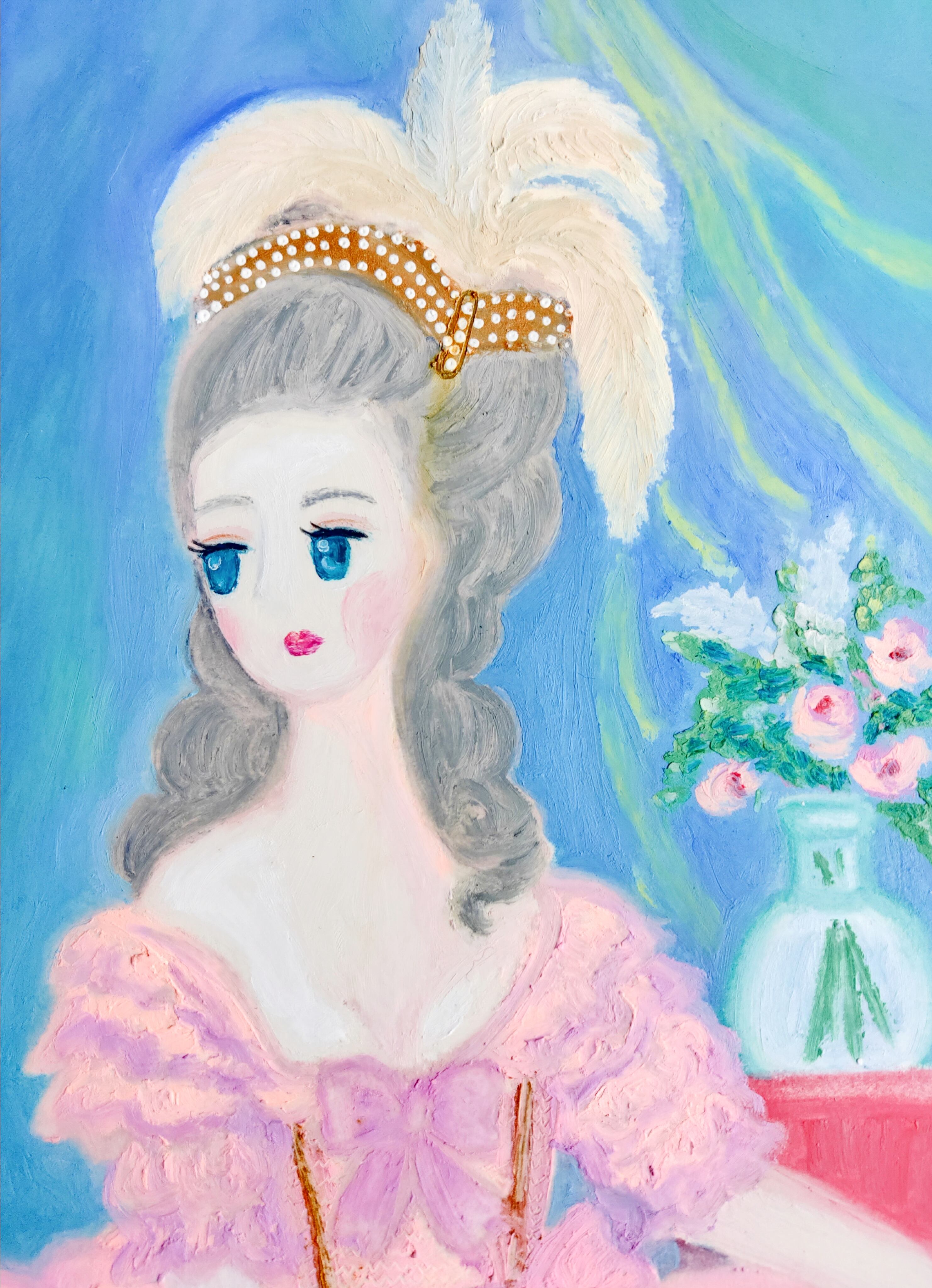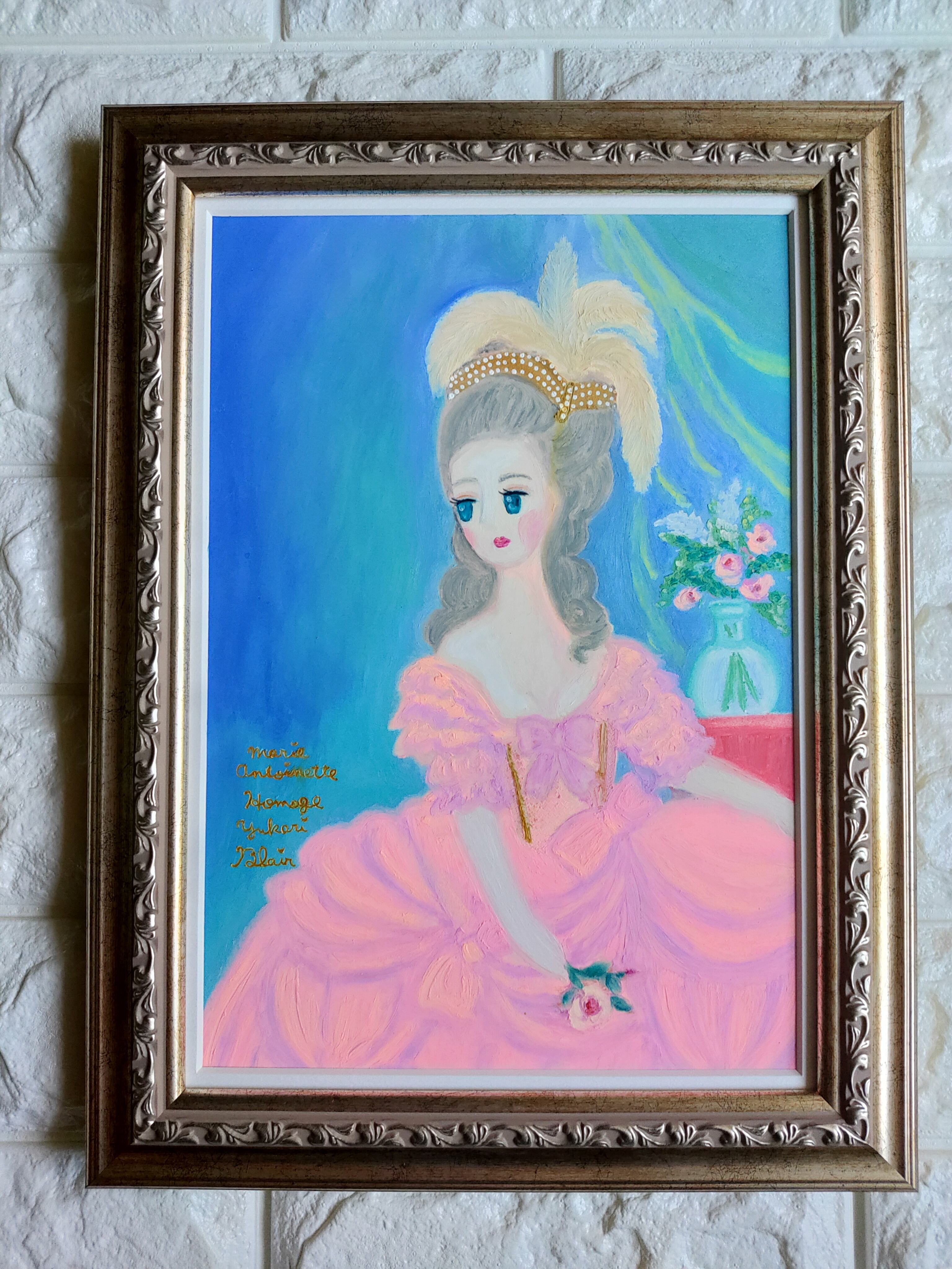 ふんわりと描いた、マリー・アントワネットへのオマージュ作品です。大好きなヴィジェ・ルブラン画伯の優雅で繊細な元絵にインスパイアされ、マリーアントワネットの愛らしさと気品を大切にしながらYukari Blairの感性で描きました。甘く柔らかな色彩と王妃の気品、や少女のような可憐さを感じていただけたら嬉しいです。