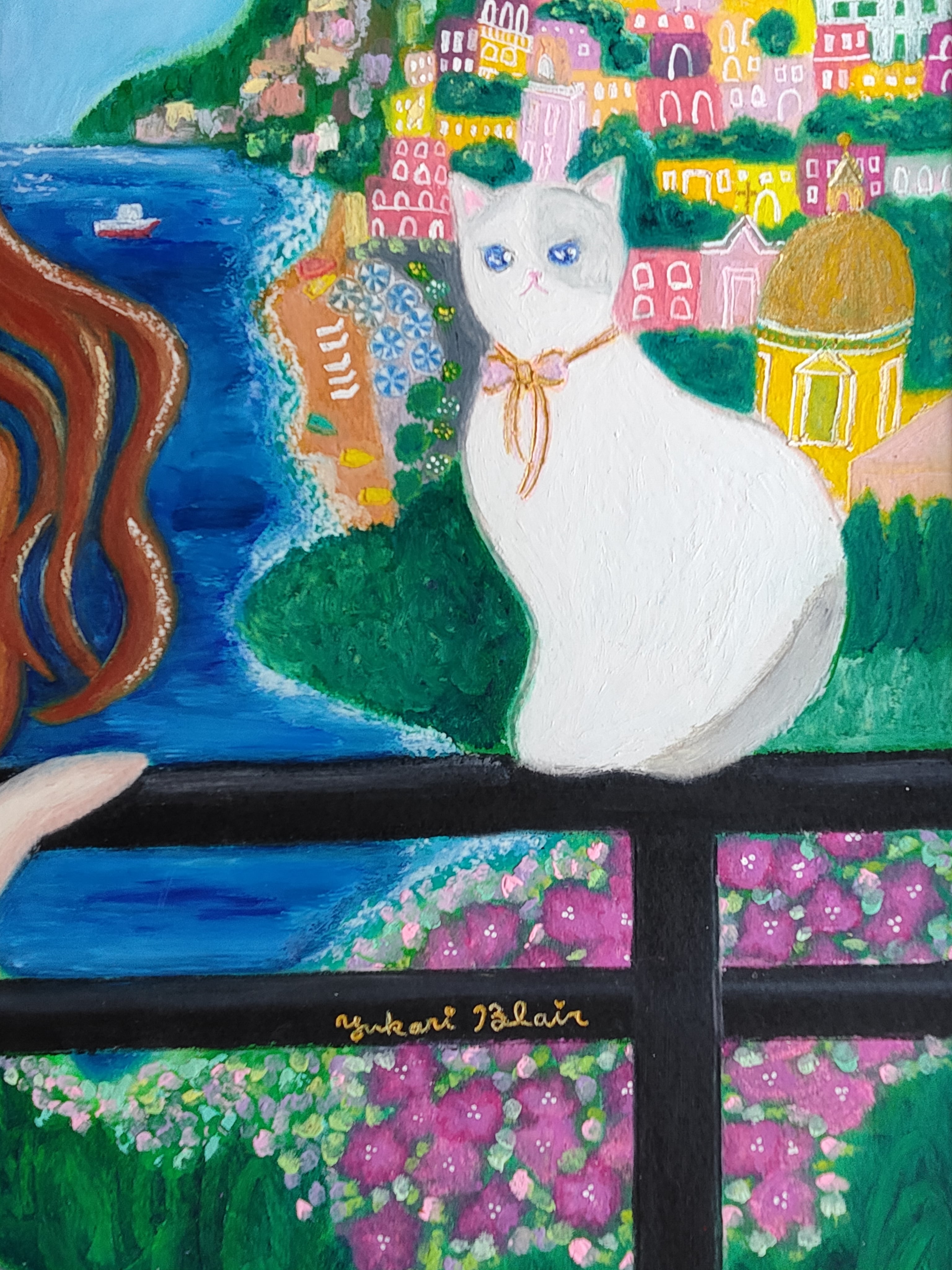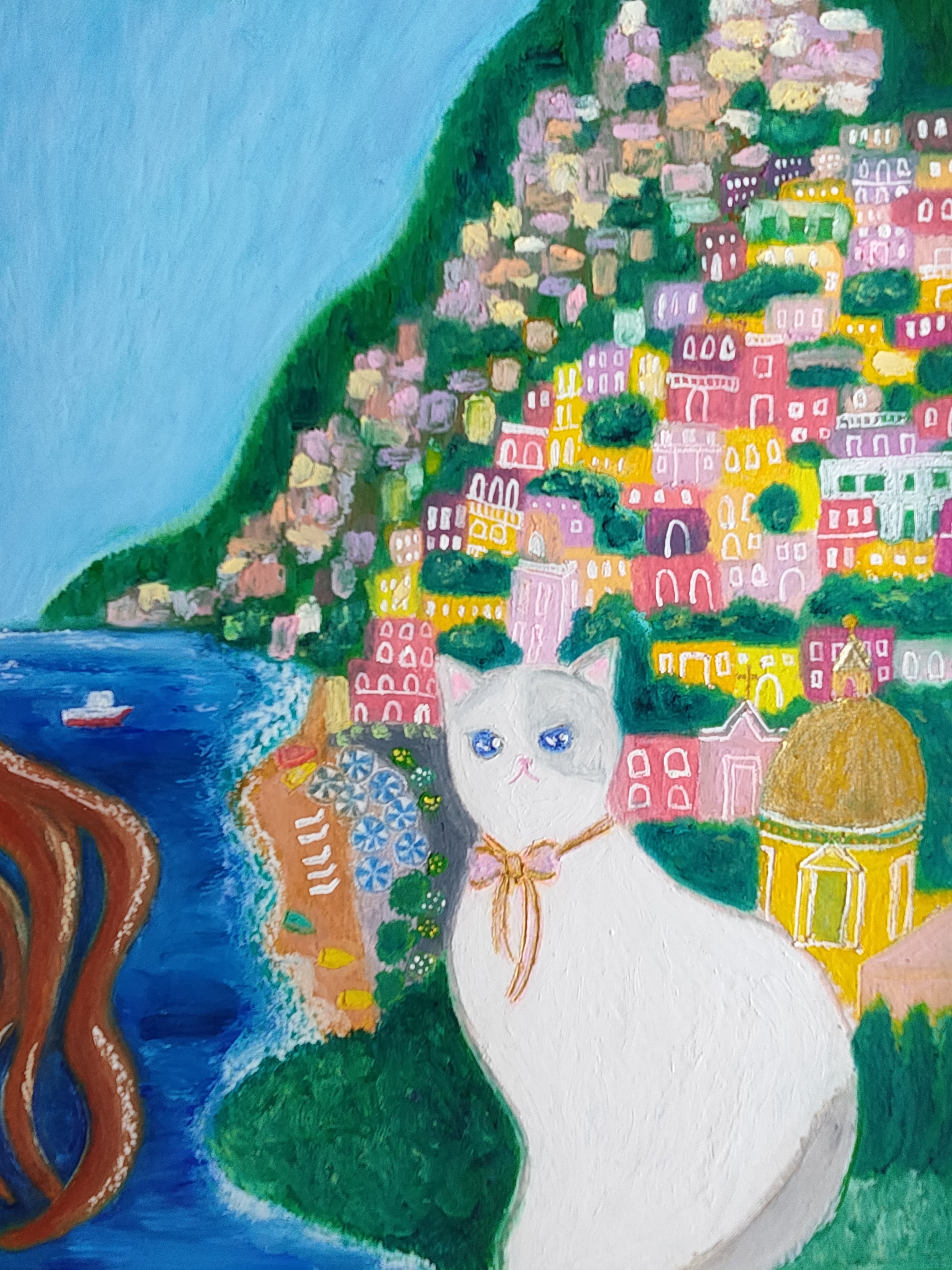 南イタリアのポジターノに訪れた時の思い出からの着想で描きました。紺碧の海と山の斜面に密集するポジターノ特有のカラフルな家々が美しくて感動した気持ちを絵の中の女性を通して表現。