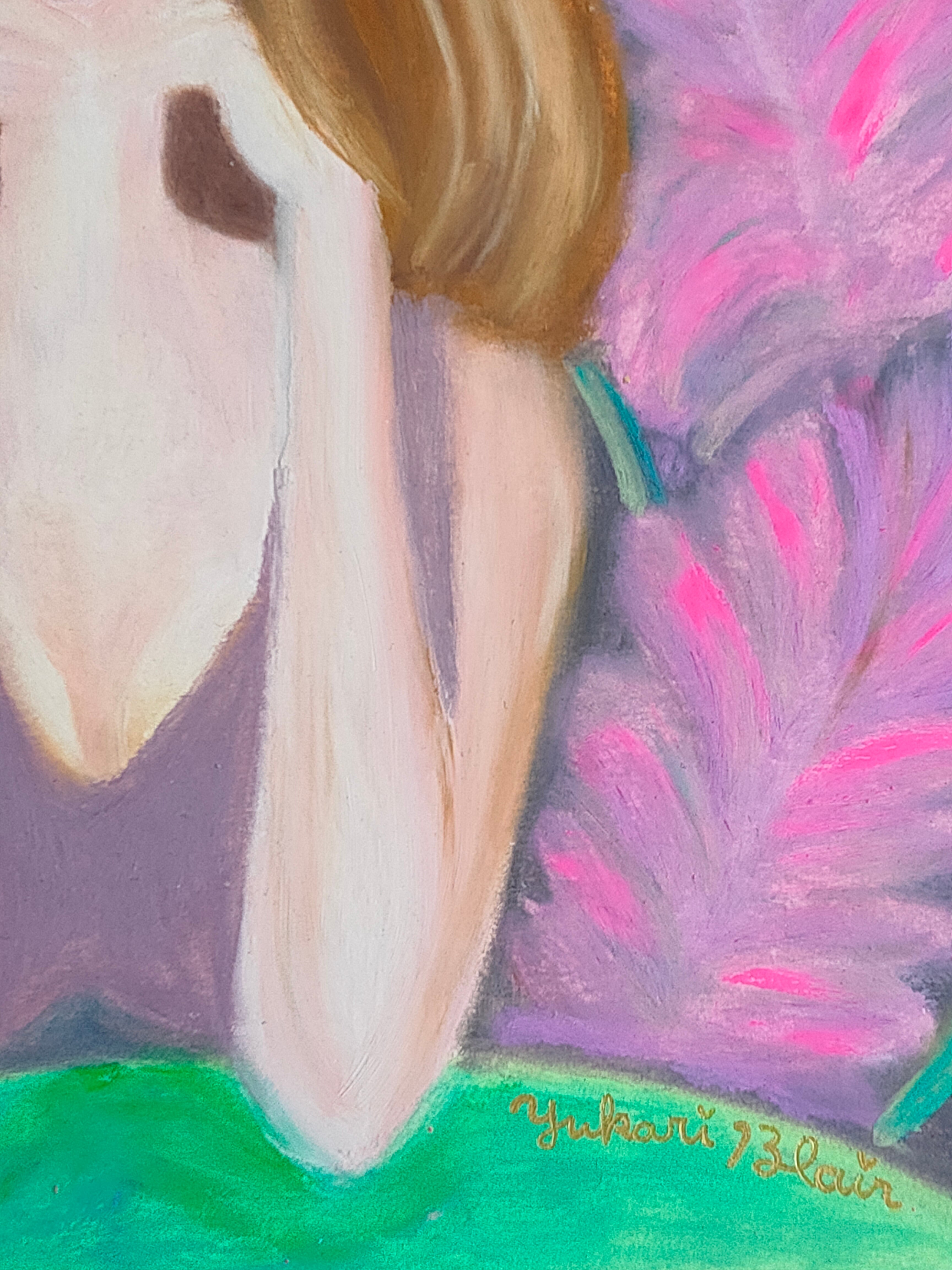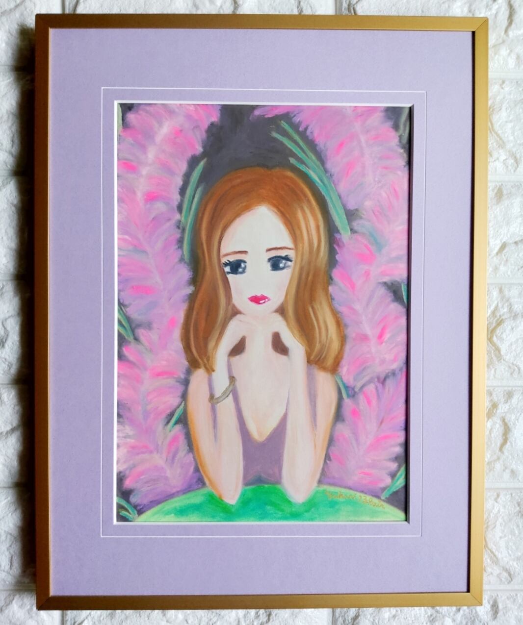 栗色の髪の真顔の女性が、テーブルに頬杖をつきながらまっすぐこちらを見つめ、その視線は静かにこちらに語り掛けています。テーブルをはさんで対話しているようなドキッとするような緊張感や切なさ、映画のワンシーンのような一瞬の美しさを表現した作品です。