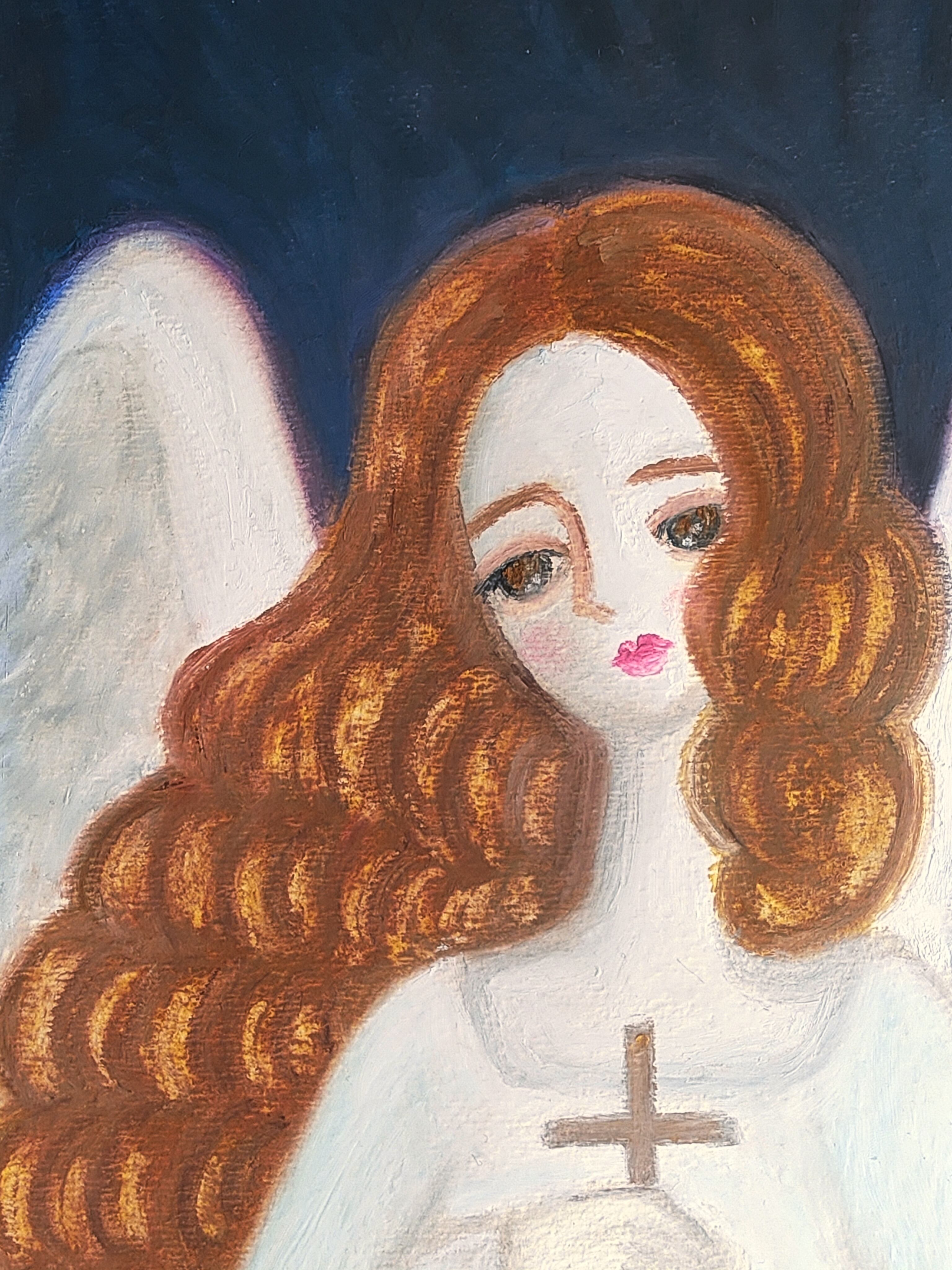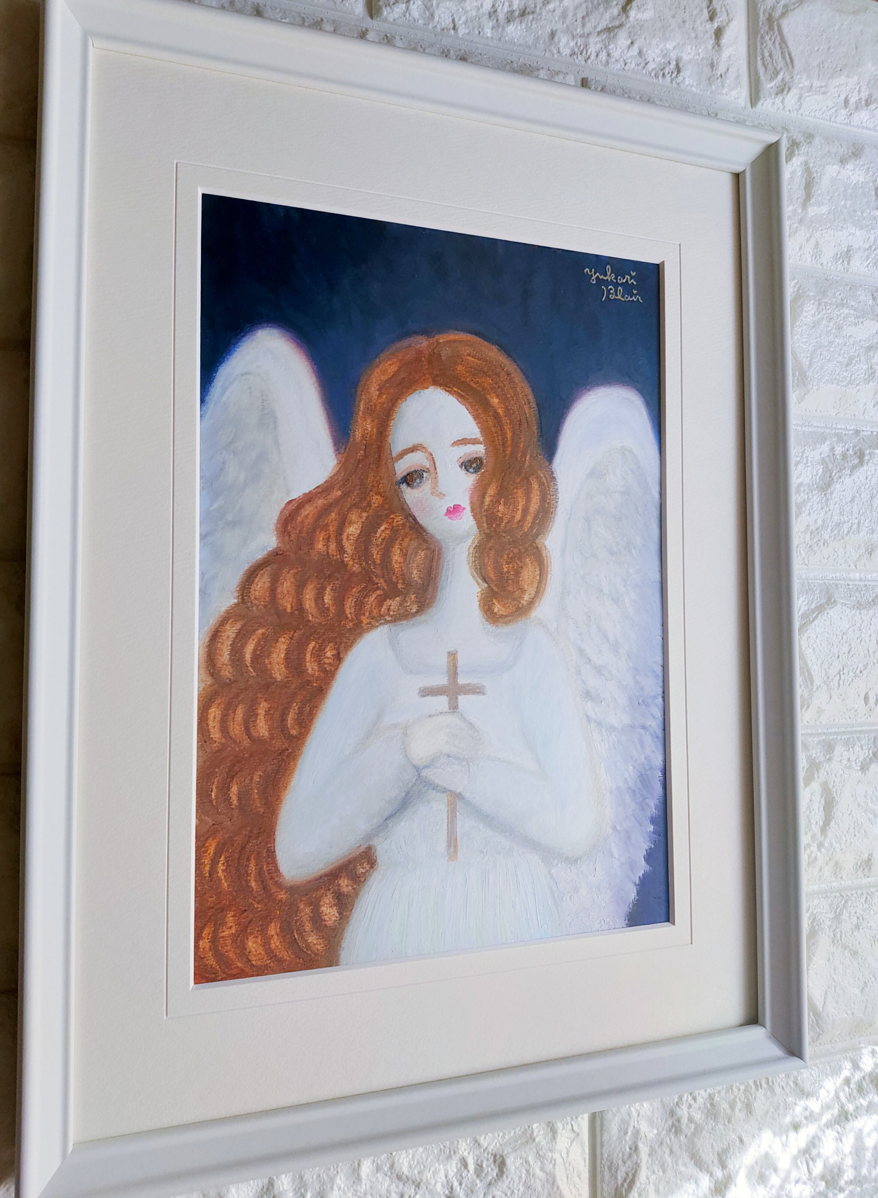 「天使の三部作 より『十字架を持つ天使』」の作品です。2023年の冬に再訪したフランス。パリの大聖堂や教会でたくさんの天使の彫刻を目にして美しすぎて心打たれました。帰国後すぐにインスピレーションを受けて天使の絵を描きたくなり天使の三部作を制作しました。フランスのクリスマスは日本とは違って聖夜は教会に行き静かに厳かに過ごすと言われています。そのようなことからも聖夜に天使が見守ってくれているような神聖で厳かな雰囲気で描きました。通年を通して天使の絵として飾っていただいたり、毎年クリスマスシーズンに飾っていただくのもオススメです。