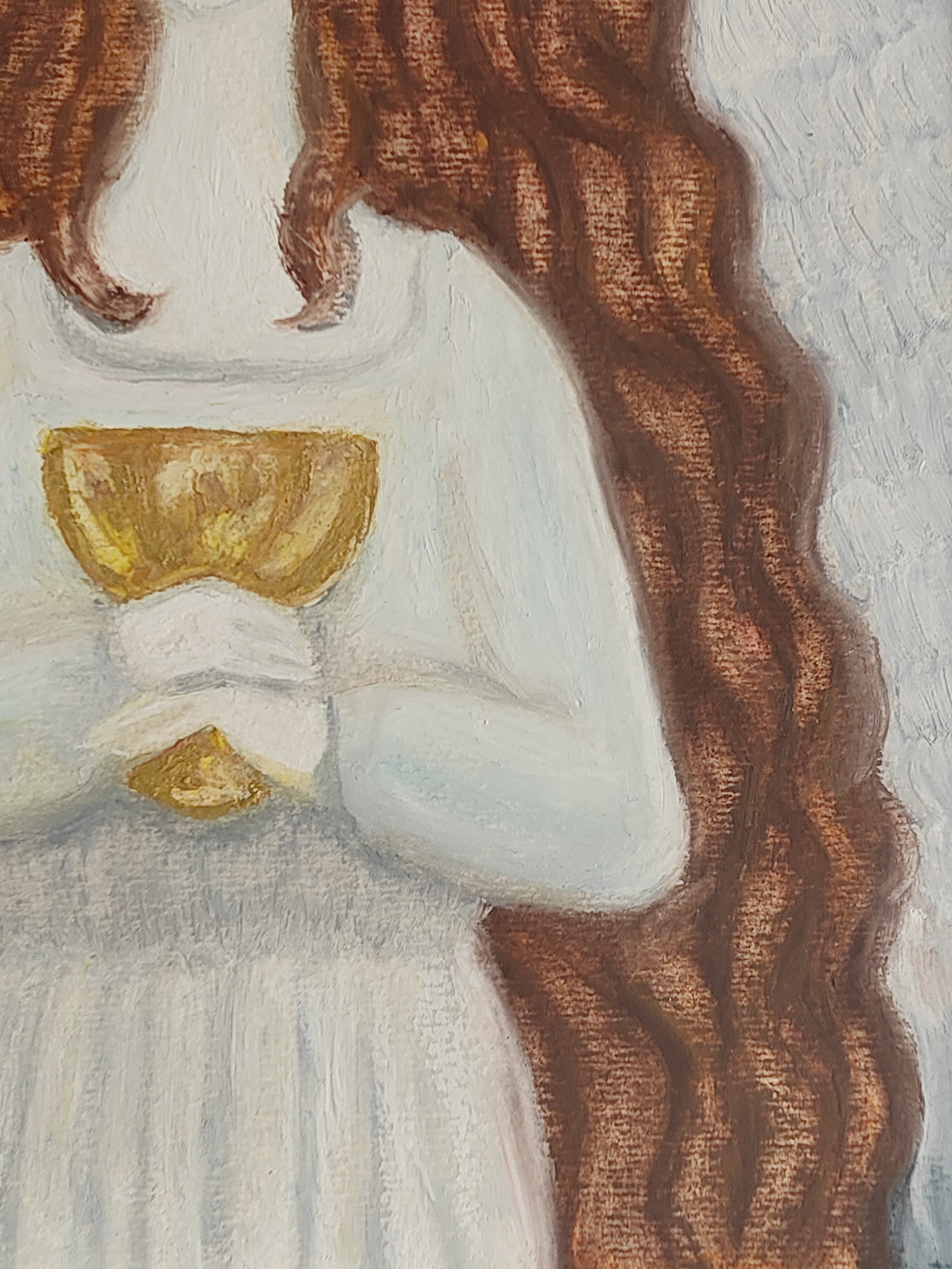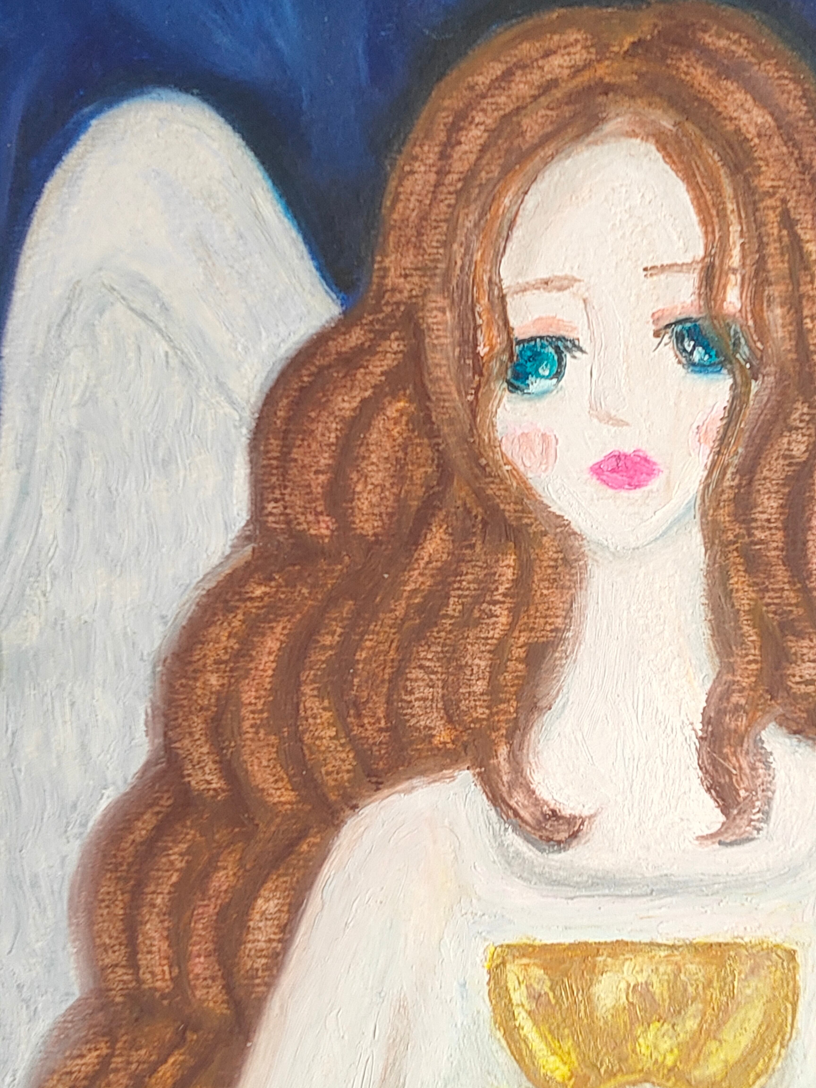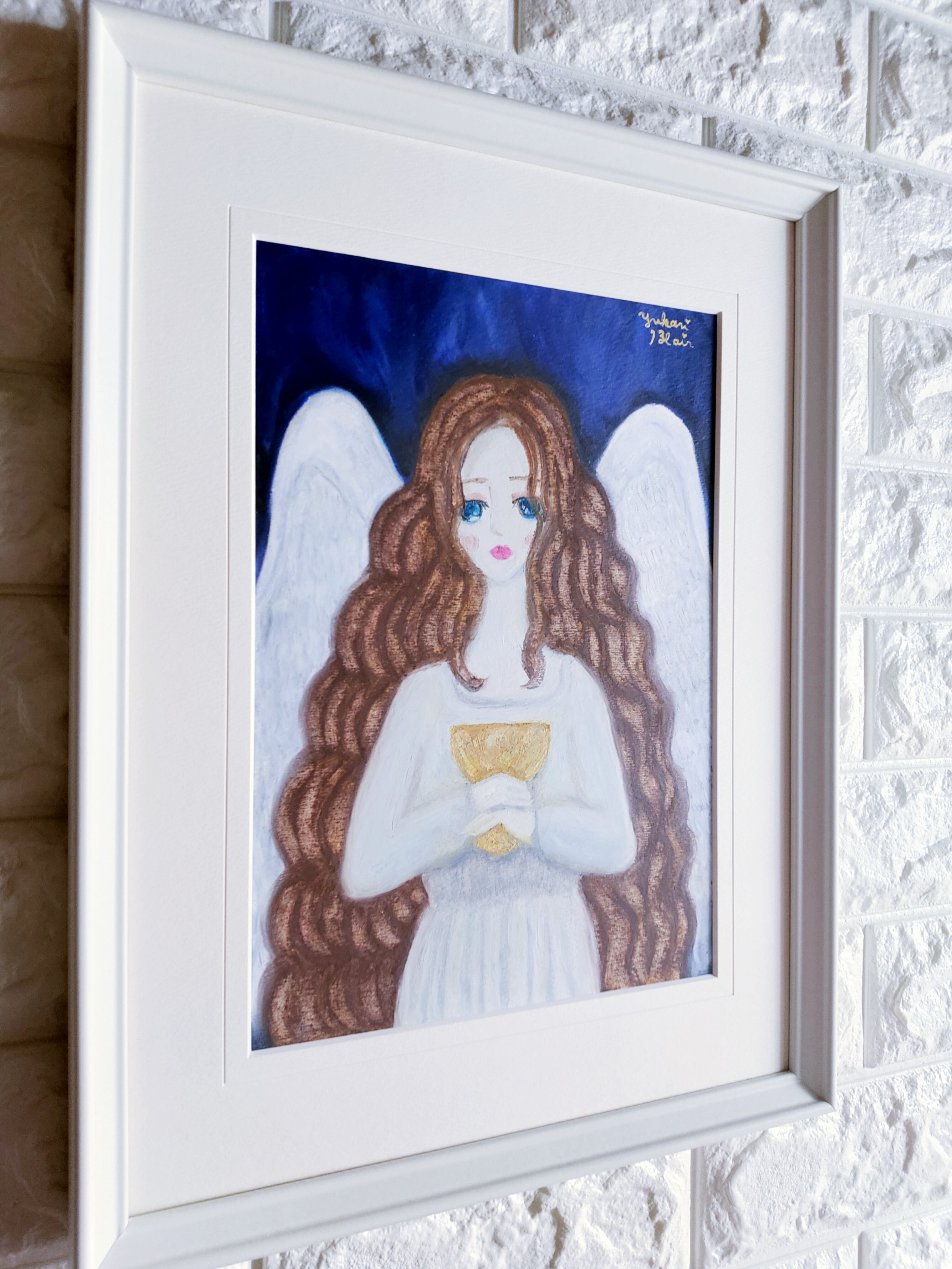 「天使の三部作 より『聖杯を持つ天使』」の作品です。2023年の冬に再訪したフランス。パリの大聖堂や教会でたくさんの天使の彫刻を目にして美しすぎて心打たれました。帰国後すぐにインスピレーションを受けて天使の絵を描きたくなり天使の三部作を制作しました。フランスのクリスマスは日本とは違って聖夜は教会に行き静かに厳かに過ごすと言われています。そのようなことからも聖夜に天使が見守ってくれているような神聖で厳かな雰囲気で描きました。通年を通して天使の絵として飾っていただいたり、毎年クリスマスシーズンに飾っていただくのもオススメです。