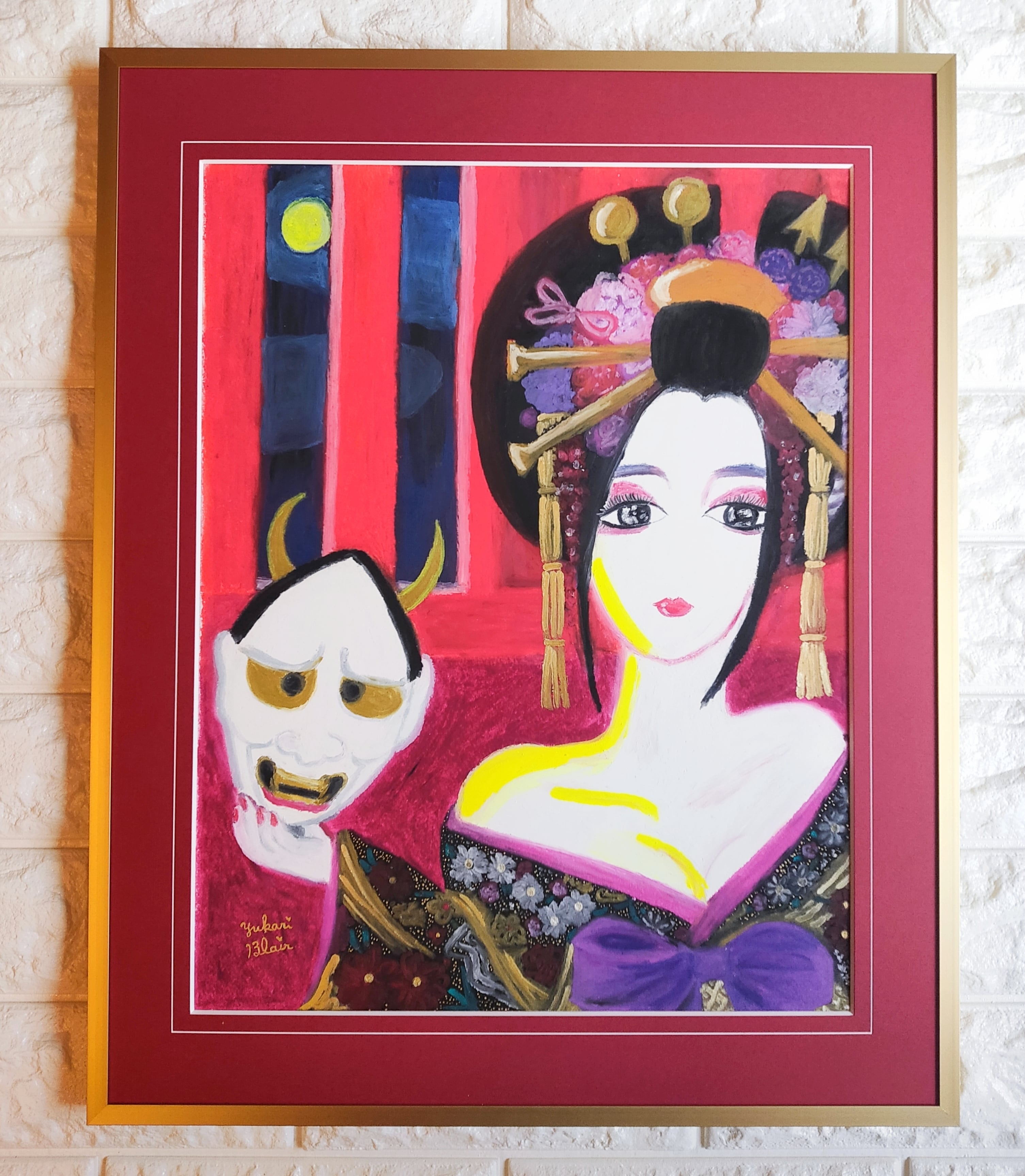 描きながら妖艶で華やかな美しい花魁の世界だけど、そこには色んな思いがが渦を巻いていたことが暗に想像でき、描きながら時に深く感情移入しながらできあがった作品です。作品に何か感じるものがありましたら、ぜひあなたの特別な空間に飾って物語の続きを感じていただけたらと思います。