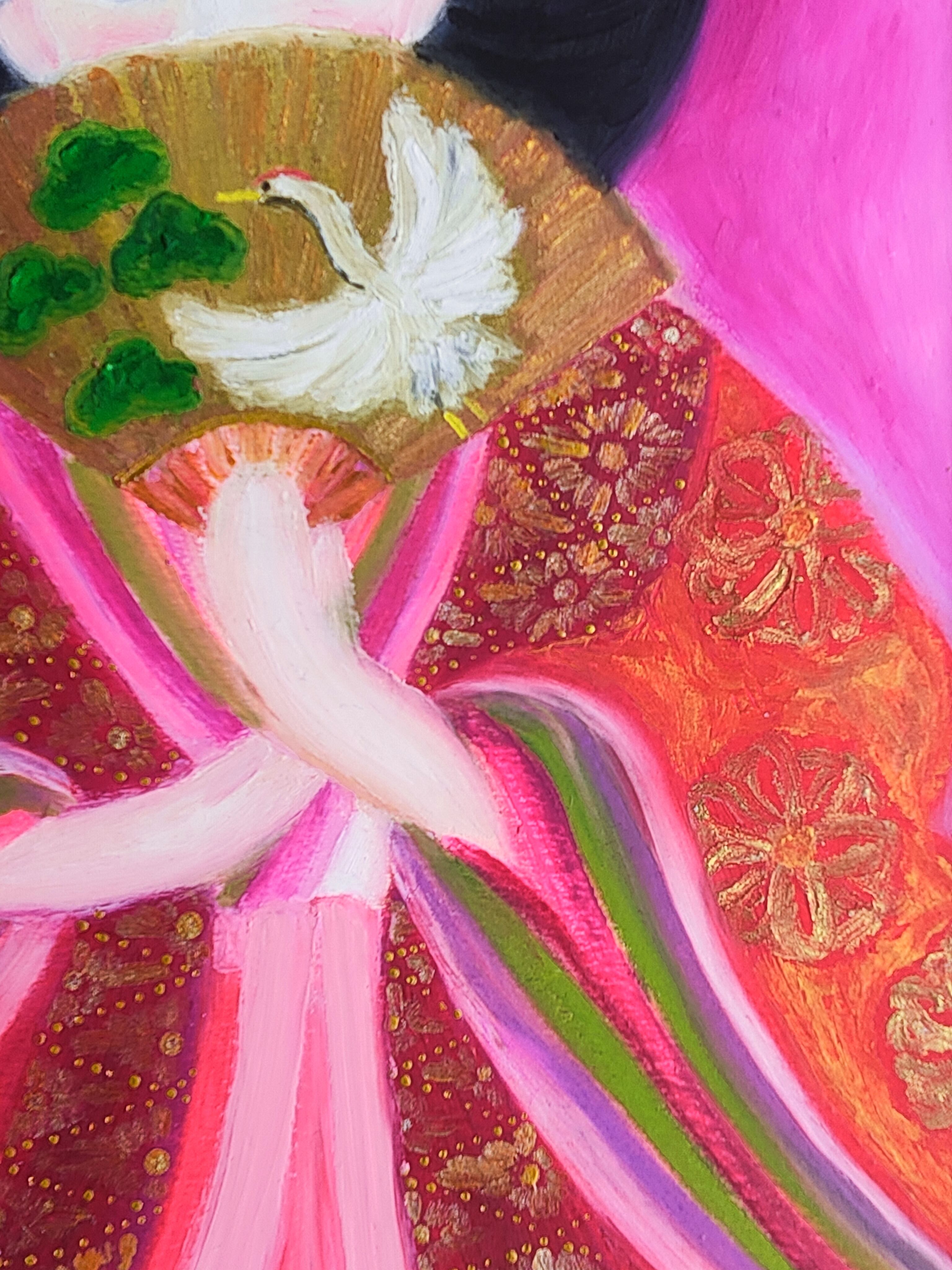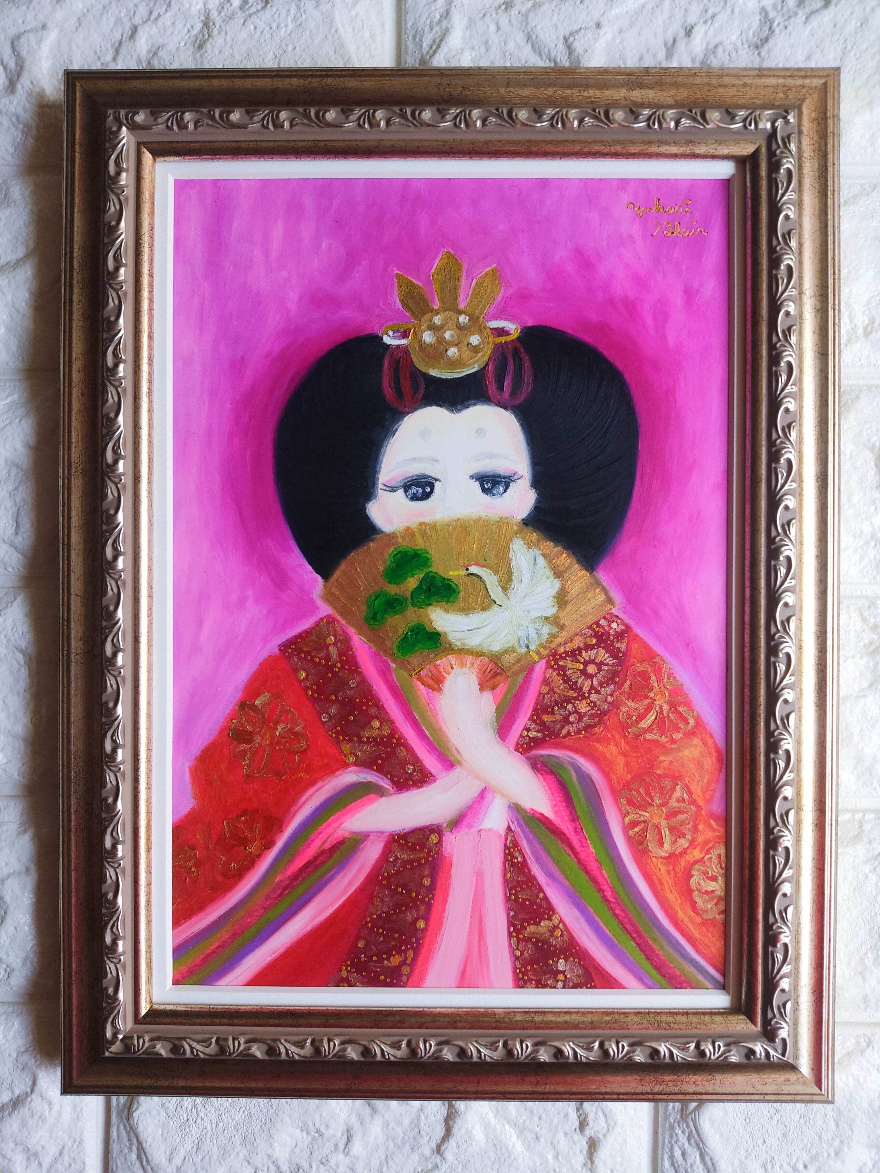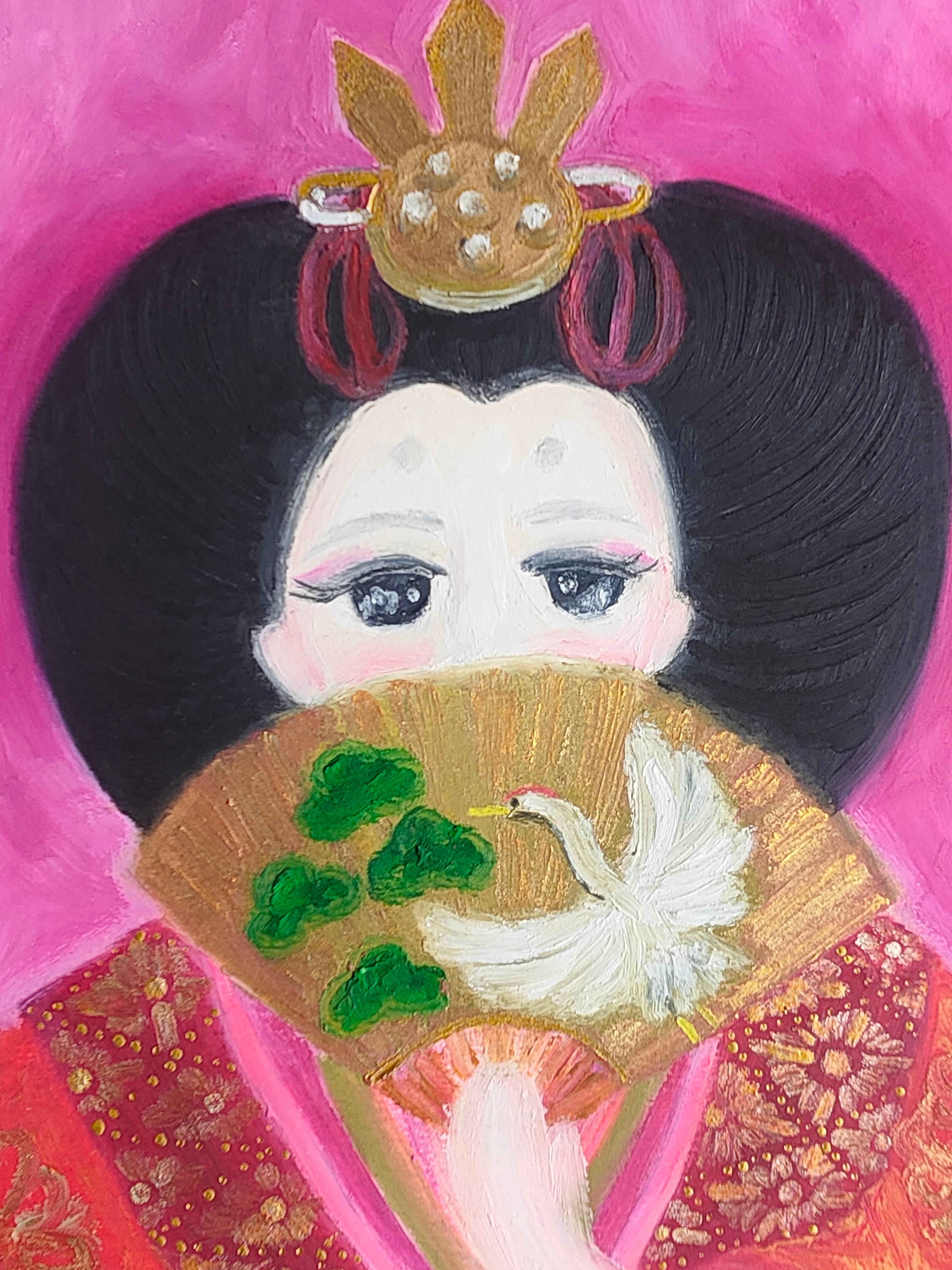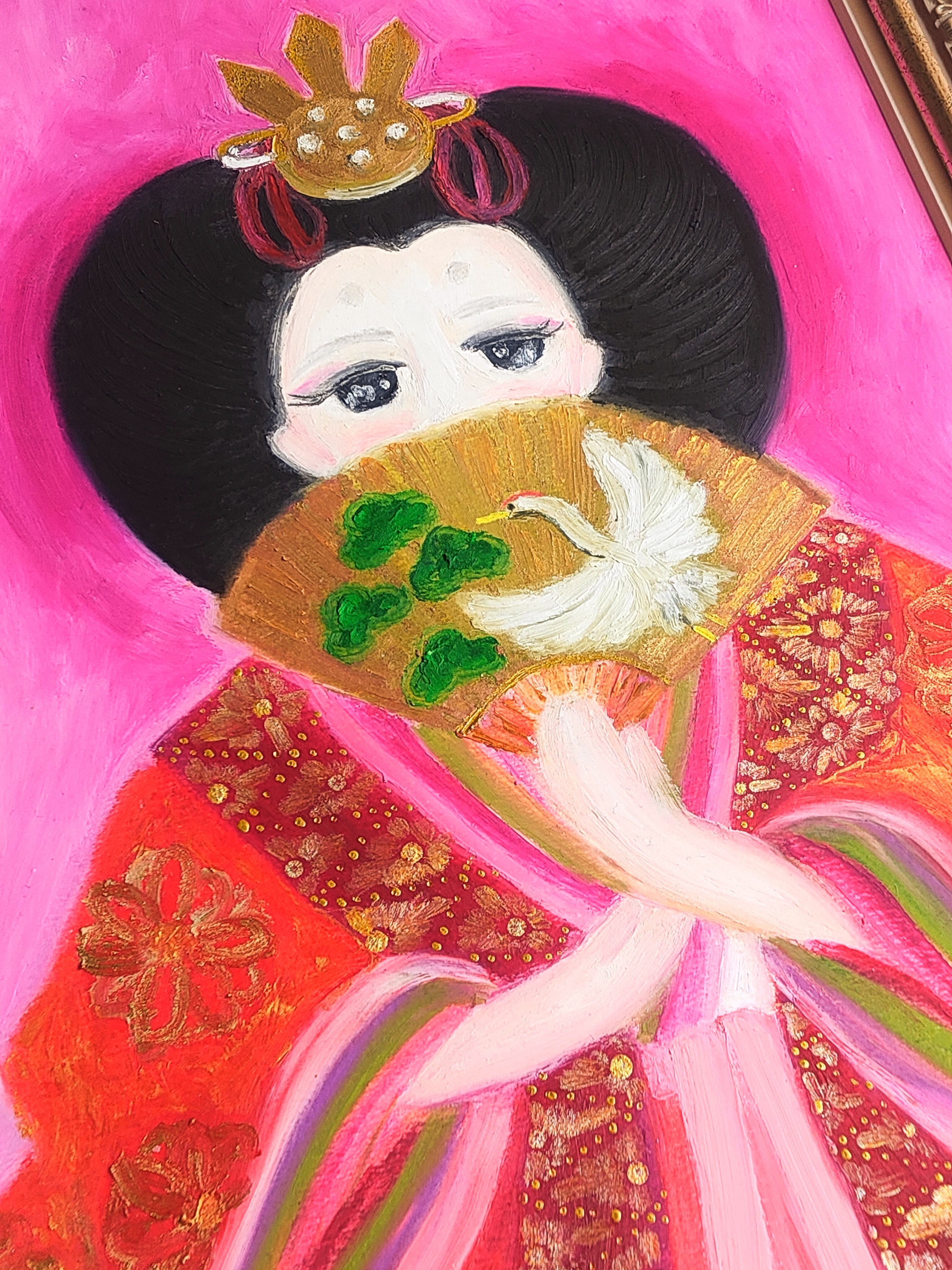 早春のある日、お雛様を描き始め描いていたら、どこからともなく「お人形としてではなく一人の女性として描いてほしい」という声が頭の中で感じられました。その感覚に導かれるように途中からはひな人形としてではなく、ひとりの女性皇后として描きました。伝統的な雛飾りの枠を超え、日本のお姫様としての美しさと人間らしさを感じていただけたら嬉しいです。